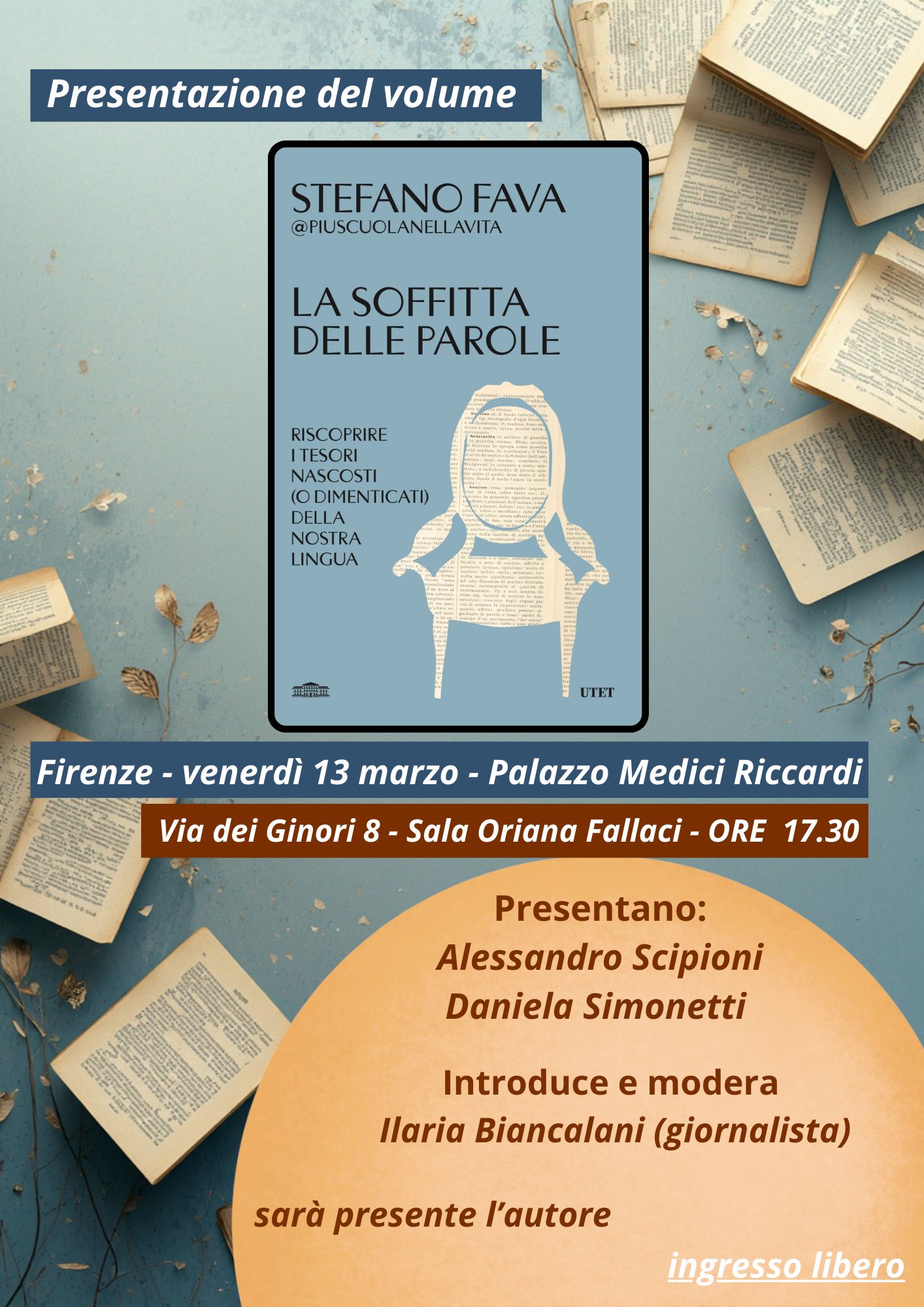 Ringraziando Stefano, ho parlato di come quel palazzo sia simbolo di Firenze – culla di bellezza dal Medioevo al Rinascimento – e di come il suo libro ci chiami a salire in soffitta per tirar fuori parole dimenticate: aporia, protervia, indefesso…