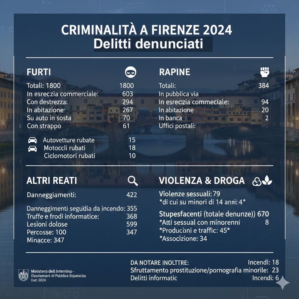 In Firenze, come provincia urbana, si segue il trend regionale ma con tassi più alti (terza in Italia per reati per 100 mila abitanti nel 2024). Il calo pre-pandemia è simile, con minimo nel 2020 (~34 mila). La ripresa è più accentuata (+10% nel 2021, +9.2% nel 2022, +5.1% nel 2023, +7.4% stimato nel 2024), riflettendo dinamiche cittadine come turismo e densità. Reati tipici includono furti con destrezza (record 11 mila nel 2024, +48%), estorsioni e violenze, con percentuali sul totale simili a Toscana ma amplificate in contesto urbano. La variazione positiva post-pandemia suggerisce bisogno di misure mirate su sicurezza pubblica.“