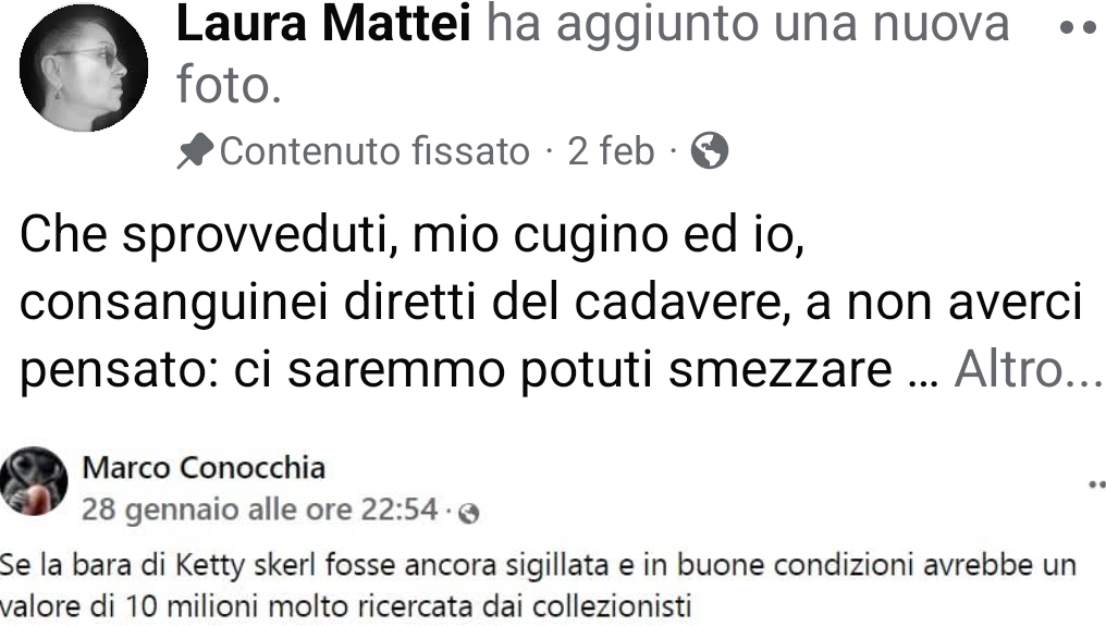 «Che sprovveduti, mio cugino ed io, consanguinei diretti del cadavere, a non averci pensato: ci saremmo potuti smezzare bei soldini… Invece, è questo signore, rinomato collezionista di reperti cimiteriali condannato a fine 2024 a due anni e quattro mesi di carcere, nonché all’epoca imputato in un altro procedimento per il furto delle ceneri e di oggetti dalla tomba di Elena Aubry e inoltre accusato di violazione di sepolcro, vilipendio, sottrazione, distruzione e occultamento di cadavere, libero come l’aria, a renderci edotti dell’occasione che ci siamo lasciati sfuggire.