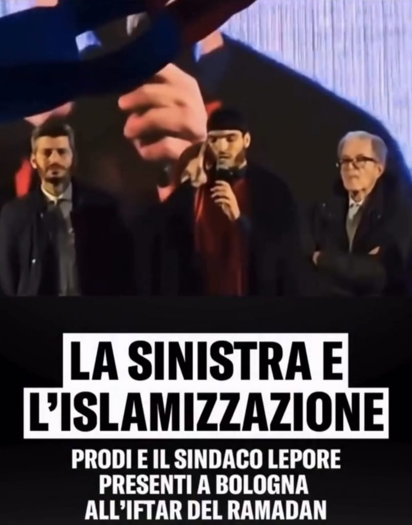 Alcuni filmati circolati sui social mostrano amministratori o esponenti politici presenti a iniziative pubbliche con leader religiosi musulmani, come Mohammad Hannoun, a Genova, dove sindaci di sinistra lo ascoltavano sotto il palco salvo poi scoprire che, di lì a poco, sarebbe stato sospettato di finanziare Hamas; o a Bologna, dove l’ex presidente Prodi appare sul palco ad ascoltare la preghiera di un imam.