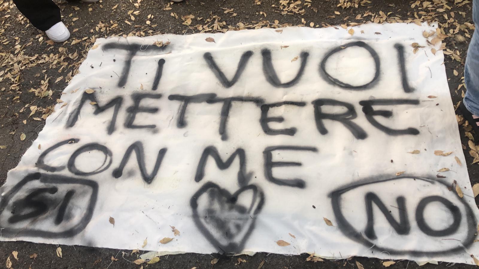 All’uscita di scuola è comparso uno striscione di tela bianca, con una frase scritta da una mano incerta ma piena di coraggio, che diceva: “TI VUOI METTERE CON ME?”